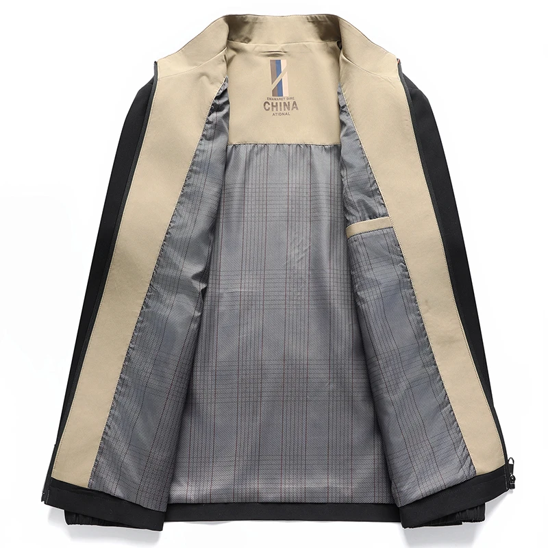 Made from premium polyester with a smooth inner lining, it offers excellent breathability and comfort for mild spring and autumn weather. The stand-up collar and full front zipper provide a clean, structured silhouette, while the simple solid design adds timeless appeal.
